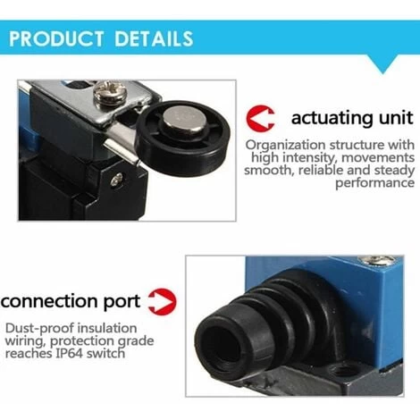 pour les commutateurs de commande électriques et autres industries. - Tension nominale: 250 V CA 5 A, CC 115 V 0,4 A; Type d’actionneur: Bras de levier rotatif réglable avec rouleau.Veuillez faire attention à la tension nominale et vérifiez la tension de votre emplacement pour vous assurer que le fin de course fonctionne
