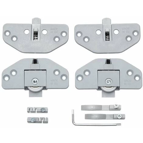 Kit complet pour porte coulissante ; 2 patins supérieurs ; 2 chariots inférieurs avec roulement à billes ; Butées arrière ; Clé hexagonale ; Pour porte coulissante de 30kg maximum ; En plastique gris ; Roulements silencieux et de haute qualité pour une longue durée de vie