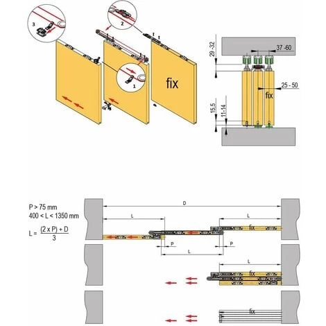 Kit pour l’ouverture progressive continue des vantaux ; 1,35m ; En tirant sur le vantail extérieur, le vantail central se déplace en douceur ; Il est possible de l’installer avec n’importe quel ensemble remplissant les conditions suivantes : distance entre le vantail et le guide 29–32 mm / distance entre les vantaux 37–60 mm (axes des vantaux individuels) ; Guides et raccords ne font pas partis du kit