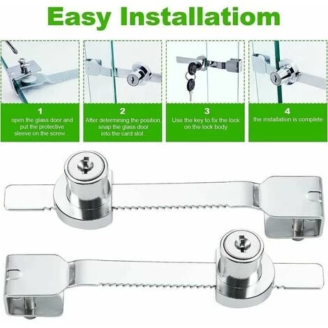 La serrure et les clés sont livrées avec un tampon de montage pour protéger votre verre fragile. Pas besoin de percer un trou, l’installation est rapide et facile. Il se glisse facilement sur le bord de votre porte vitrée.