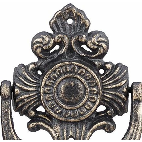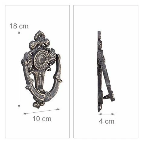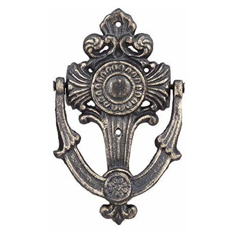 Heurtoir de porte avec ornements décoratifs pour donner un style ancien nostalgique à votre porte d’entrée. Ce marteau de porte représente une alternative intéressante et originale aux sonnettes ou carillons de porte classiques. Donnez un air de manoir à votre porte d’entrée avec ce heurtoir design en fonte. Il suffit d’actionner l’anneau de frappe de haut en bas afin de toquer sur la porte.